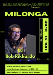 Danseur de Tango depuis une dizaine d’années, le besoin d’exprimer la technique de danse acquise a porté Bob vers la musique. Dj dans l’Ouest depuis 2013, son programme musical est le reflet de l’émotion de la danse. Lents ou rapides, les rythmes peuvent être entrecoupés de nuances suaves ou mélancoliques donnant à la danse du Tango la passion qui le caractérise. Cela s’applique particulièrement à la période de l’Age d’or (1940-1955) qui offre à la fois des tangos rythmiques (D’Arienzo, Biagi, Donatoà) et des tangos mélodiques (Laurenz, De Angelis, Puglieseà). C’est le répertoire privilégié de Bob, souvent en instrumental, parfois chantés car le recours à la voix offre une autre dimension à l’expression du tango. Quelques orchestres contemporains font aussi partis de cette programmation pour leur qualité musicale et leurs interprétations plus sophistiquées des standards. Rythme et Passion, qu’il s’agisse de tango, de valse ou de milonga, sont les mots -clefs de sa programmation, donnant à la milonga une couleur à la fois festive et intimiste.