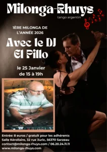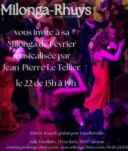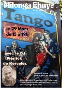 L’association Milonga-Rhuys organise une milonga de quatre heures chaque mois, habituellement le dernier dimanche du mois de 15 à 19h. Il peut y avoir des exceptions, n’hésitez pas à consulter le calendrier annuel des activités qui est mis à jour dès la rentrée des associations (Septembre) et à vérifier l’horaire sur l’affiche de la milonga du mois.